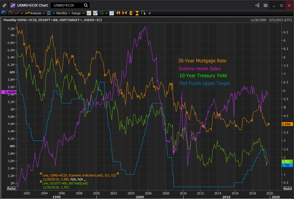The decline and return in home sales followed at a two to three month delay the rise of mortgage rates from 4.22% in December 2017 to 5.15% in October 2018 and then back to 3.99% this month.