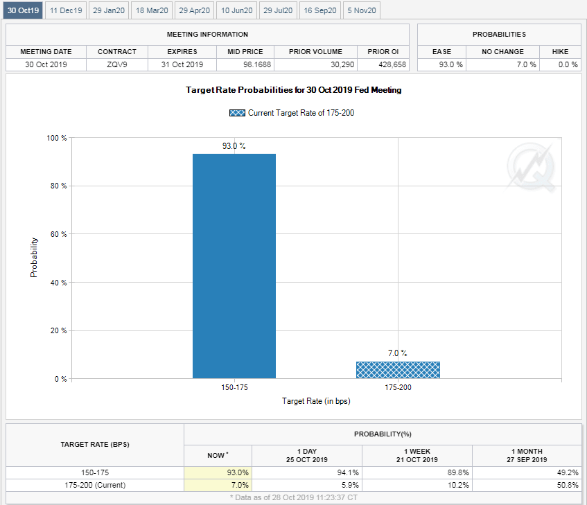 The US central bank is expected to reduce its base rate by 25 basis points for the third time this year at Wednesday’s meeting. The futures markets rate the odds of a cut at 93.0%.