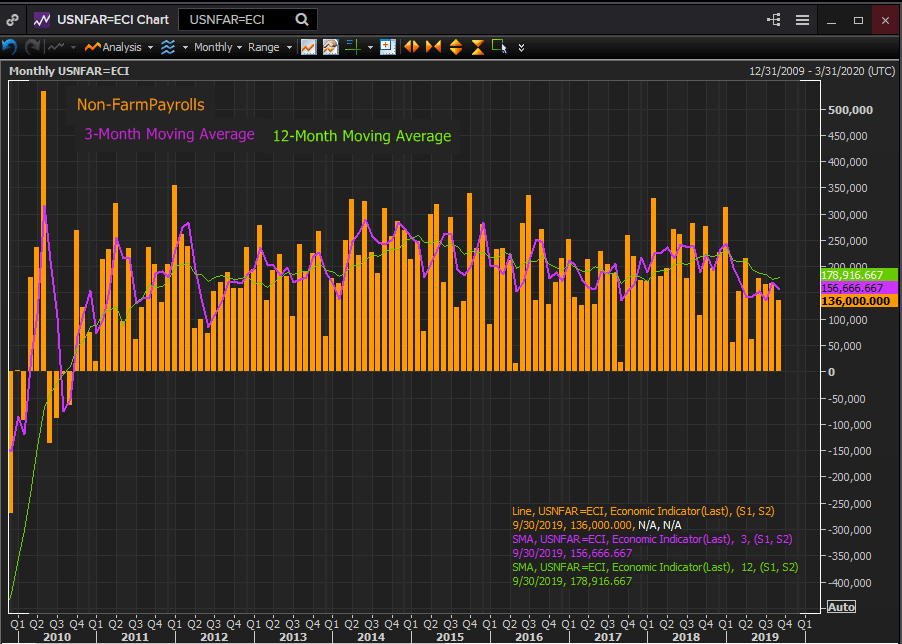 Despite the slowdown in economic growth from 3.1% in the first quarter to 2.0% in the second and estimated 1.7% in the third, hiring has remained healthy. The three month moving average in September of 156,000, combined with the backlog of unfilled position from the last two years has kept the pressure on wages. The 2.9% annual gain in September was the first month in 13 that had not received at least a 3% increase.