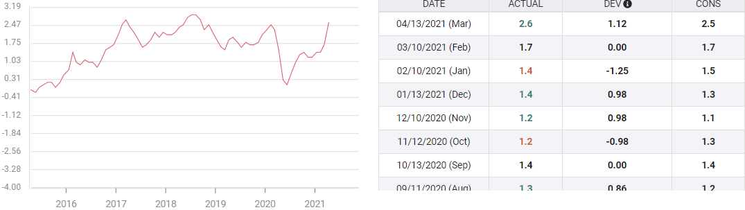 Core prices are predicted to be unchanged at 0.3% on the month but to rise 2.3% annually in April from 1.6% in March