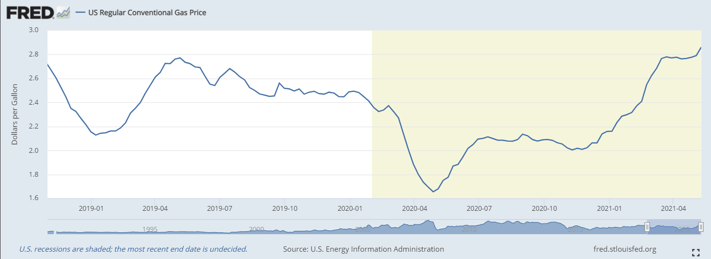 Gasoline prices have gone up in tandem. From a nationwide average of $2.02 a gallon on November 2, prices have climbed 43% to $2.86 on May 10. The gains are a compound of rising demand as the pandemic has waned and the Biden administration’s energy policy, which has eliminated all new oil production leases on federal land.