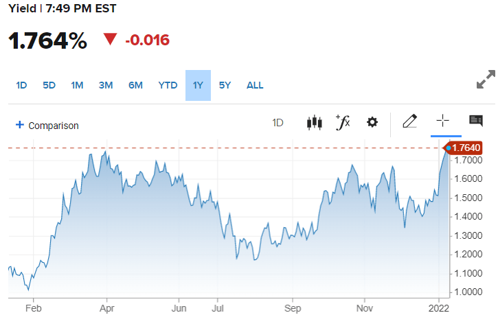 The 10-year note has added 25 basis points to 1.764% in the six sessions since closing at 1.512% on December 31. The 30-year return has climbed 18.5 basis points to 2.09%.