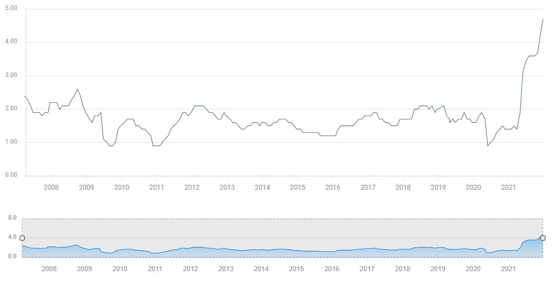 Core inflation, excluding food and energy prices, has vaulted 3.5 times, from 1.4% at the start of last year to 4.9% in November.