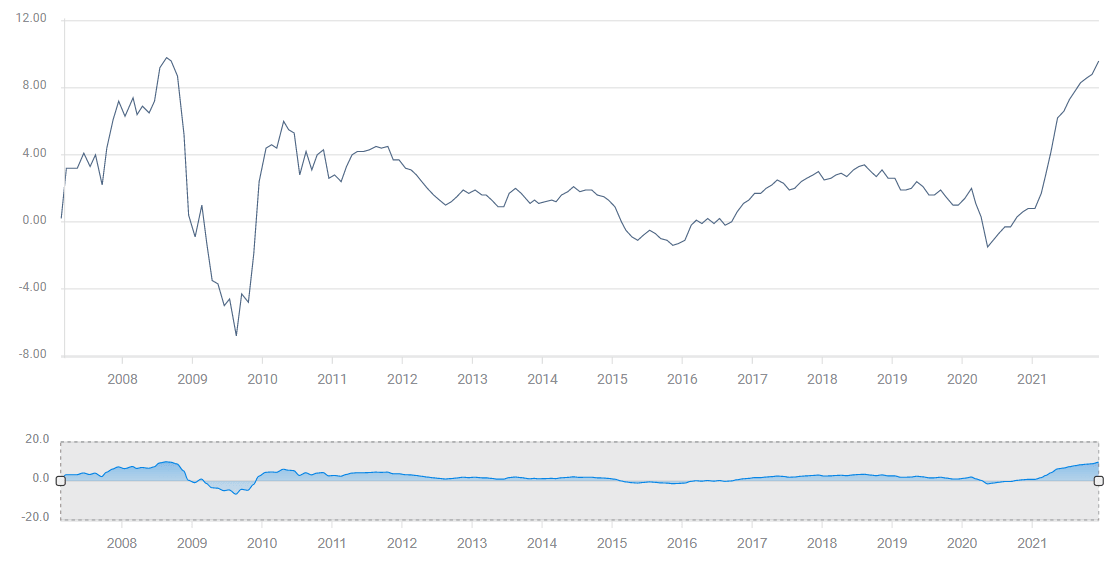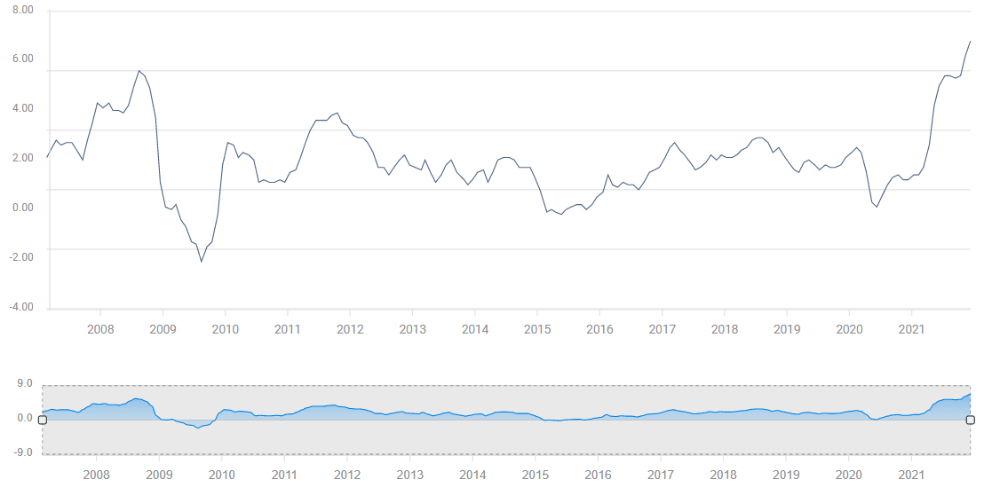 The US Consumer Price Index (CPI) multiplied 4.8 times in eleven months, climbing from 1.4% in January 2021 to 6.8% in November. This is the largest increase in the annual rate over 12 months in history.