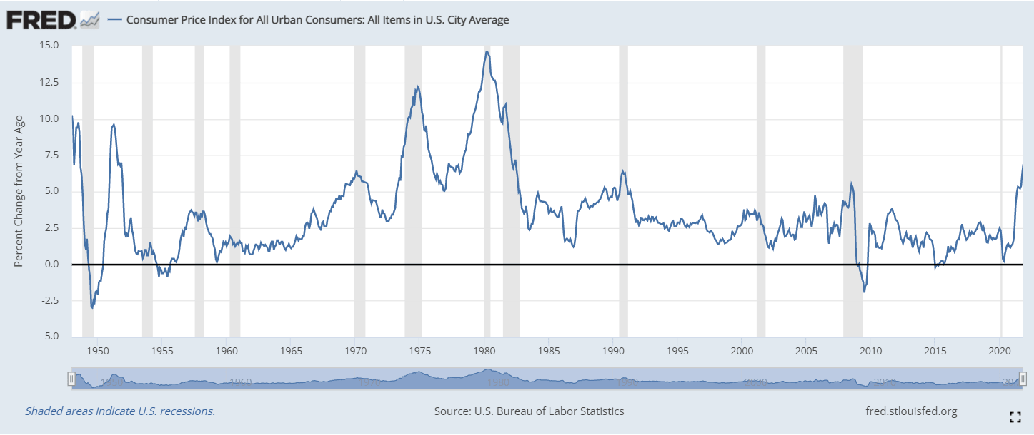 If the 7% and 5.4% forecasts for December are correct, overall CPI will have rocketed 500% in 2021 and core will have climbed 385%.