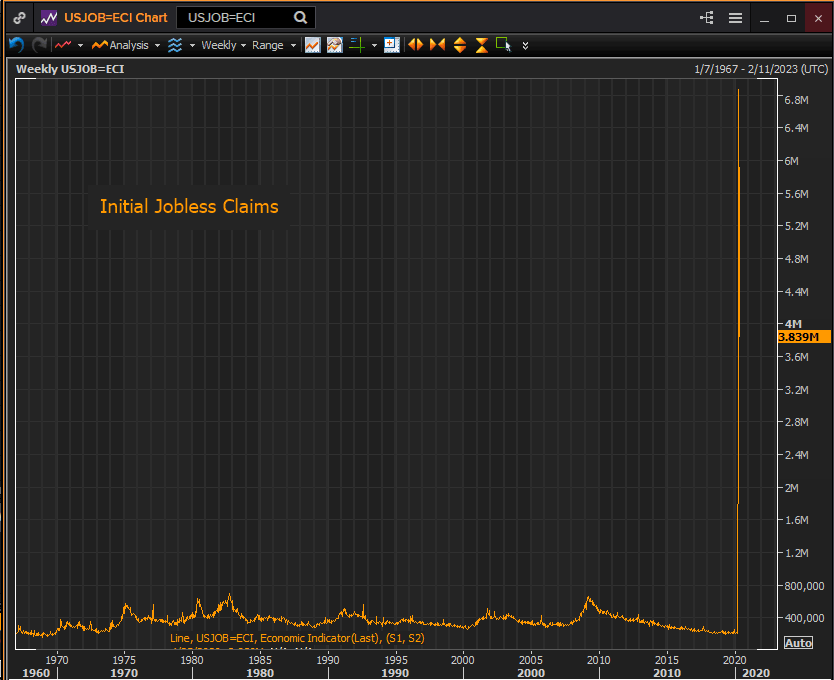 There are three overriding questions for the equity, currency and credit markets. How deep will the second quarter contraction be? How much of it has been priced into the markets already by the shock of the initial claims numbers? Finally, and most important will the attempted reopening of economic life in Florida, Georgia, Colorado and elsewhere succeed? If it does then other states, even New York and California will be forced to follow and the possibility of a rapid recovery improves measurably.