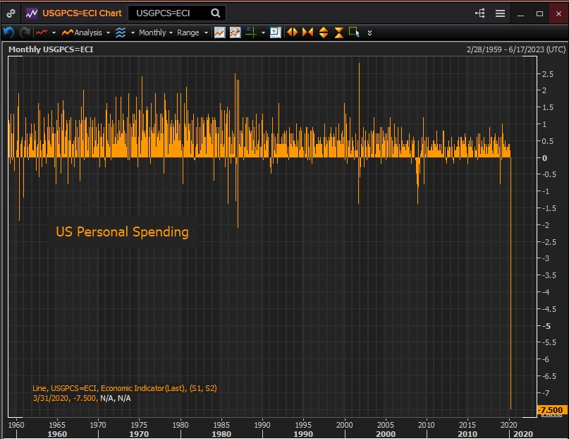 Personal spending, which accounts for about two-thirds of US economic activity, dropped 7.5% in March according to the Bureau of Economic Analysis, in a series that goes back to 1959. The median estimate from the Reuters survey of economists was -5% with a range of -0.6% to -14.9%. Adjusting for inflation consumption fell 7.3%, also the most on record.