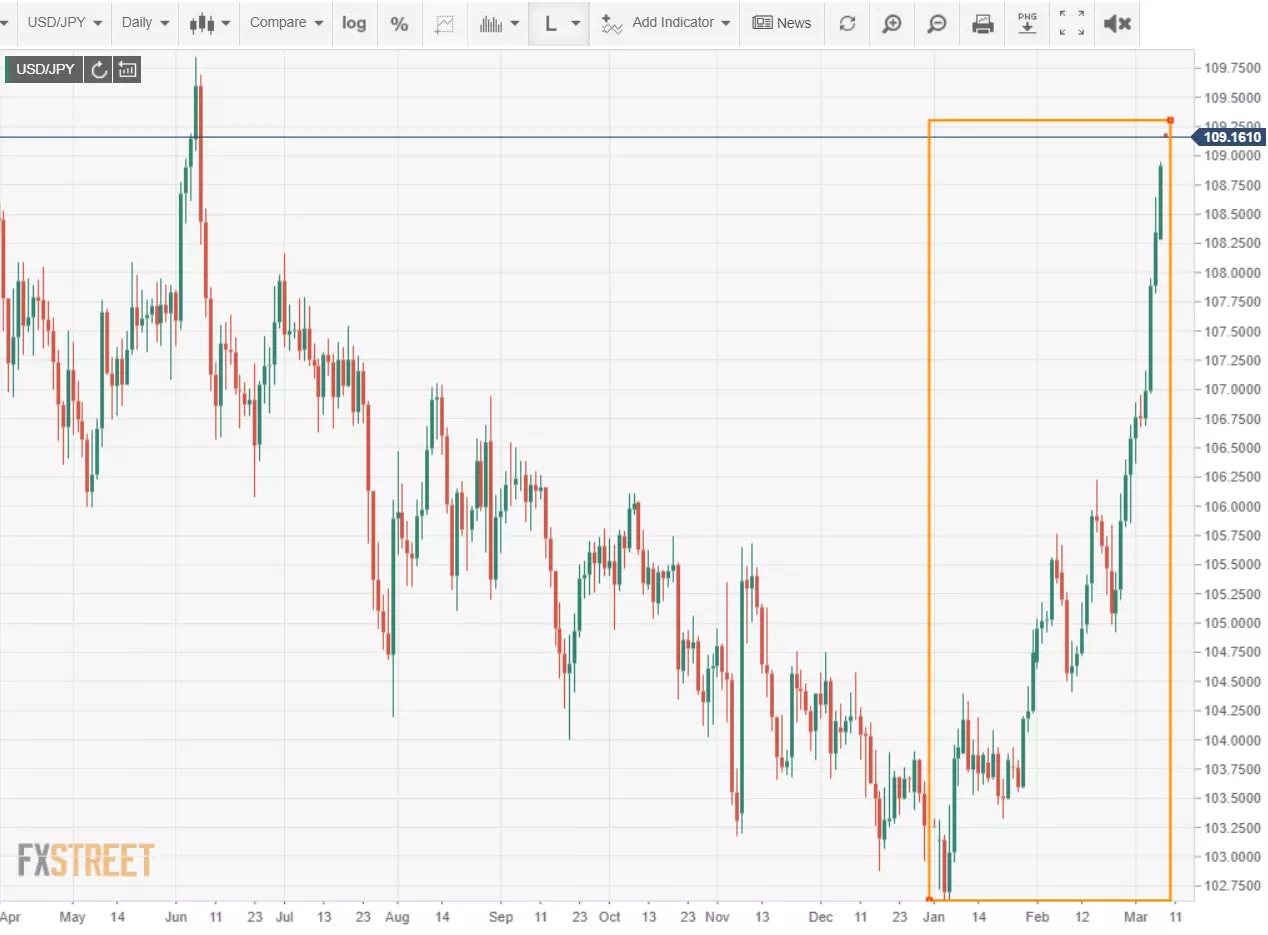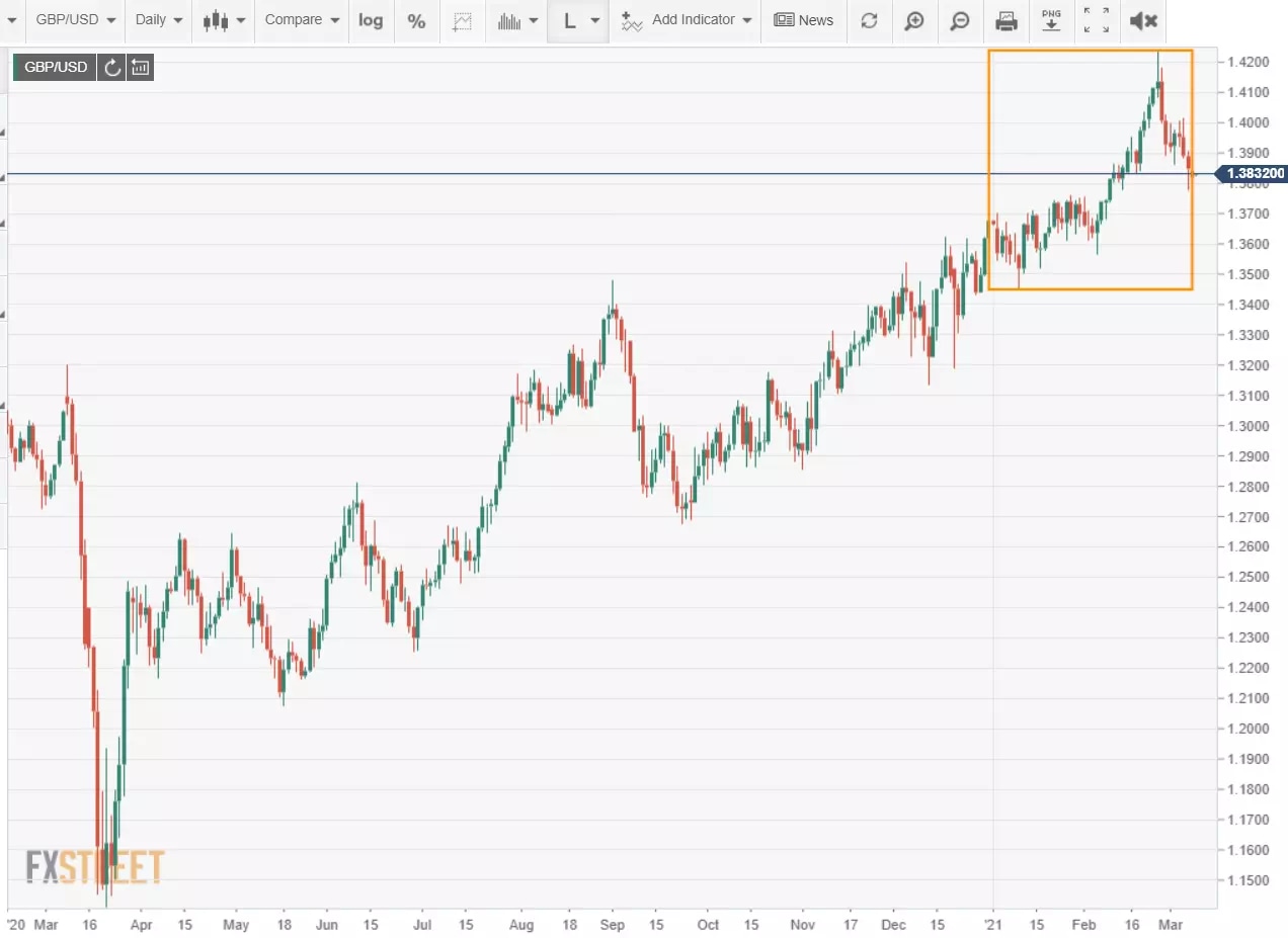 The contrast to the sterling is instructive. The UK's pandemic response and growth potential from Brexit have the pound ahead by a modest 1.1% since December 31, though it has lost 2.2% from its high of 1.4137 just two weeks ago on February 24.