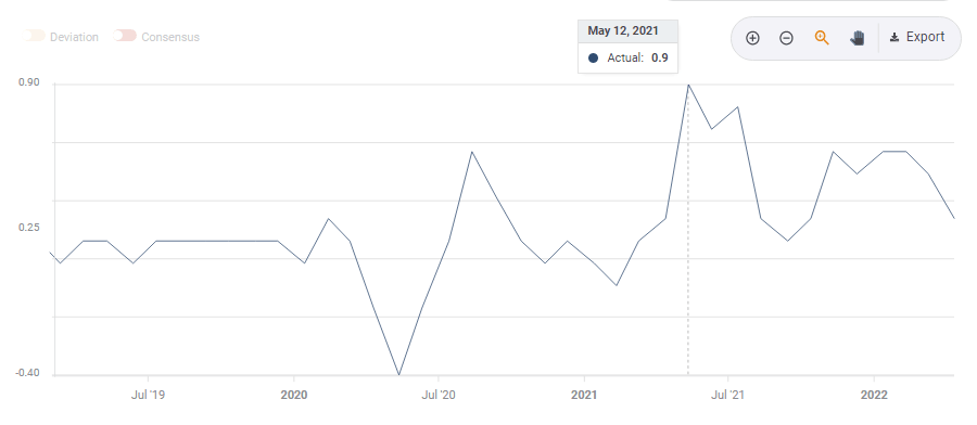At this time last year, inflation jumped due to the one-off effects of the rapid reopening of the economy and stimulus checks, while April this year was already a normal month. Core CPI leaped by 0.9% in April 2021 and no economist expects a similar rise this time. That is why annual figures are set to fall significantly, putting the focus on monthly data.