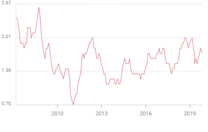 The personal consumption expenditure price index (PCE) has averaged 1.785% since January 2017, with a range from 1.3% to 2.5%. In January 2017 it was 2.0%, in September 2019 1.3%.
