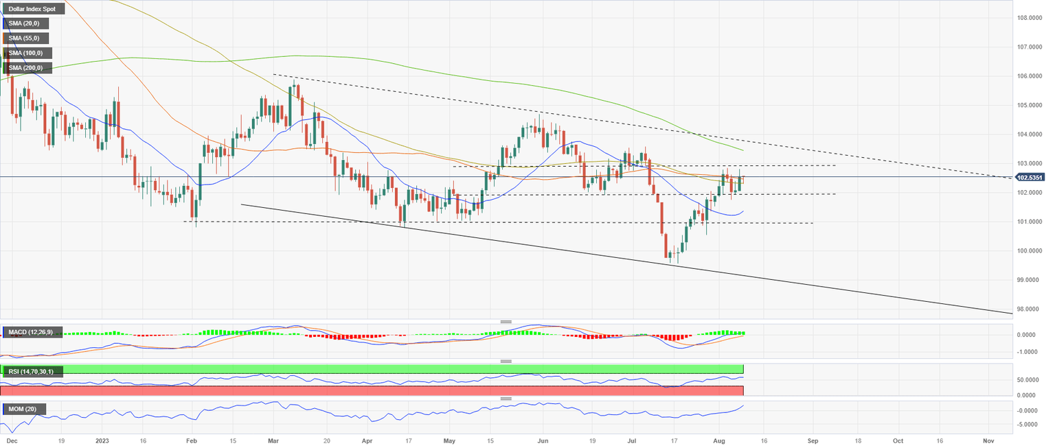 During the upward move, the DXY encountered resistance below the 103.00 area and around the 55-day and 100-day Simple Moving Averages (SMAs). If the DXY manages to break above this resistance, it would likely continue its ascent and test the 200-day SMA at 103.45, followed by the upper trendline of the downward channel at 103.75.