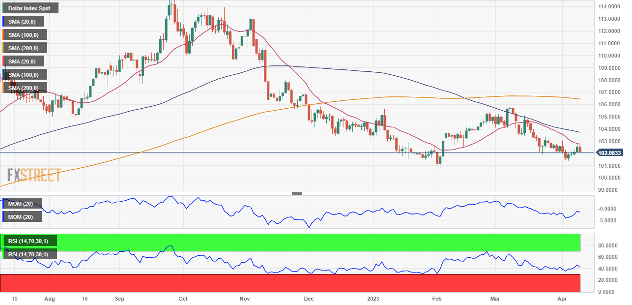 The Dollar Index (DXY) hovers around 102.10, and the bearish trend is evident in the daily chart, meaning its reaction will likely be more relevant in the case the report triggers a US Dollar sell-off. In the mentioned time frame, moving averages gain downward traction above the current level, in line with the dominant trend. The 20 Simple Moving Average offers dynamic resistance at around 102.75, while the 100 SMA comes next at 103.70. At the same time, technical indicators have resumed their declines after failing to overcome their midlines into positive ground.