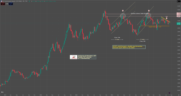 - US 10Y yields formed a double top formation between April 2024 and January 2025 by failing to break 4.74% and 4.81%.