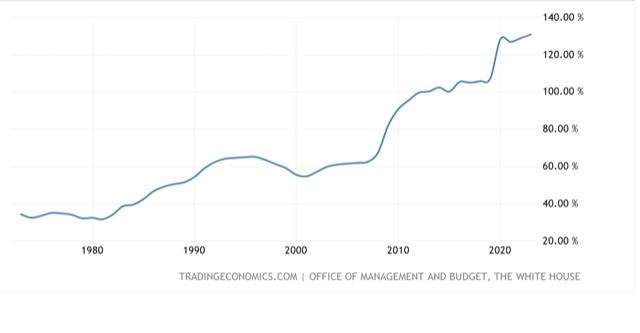 US debt to GDP has risen from 35% in the 1980s, to 129%. It leapt the last 30% in just the past few years suddenly with the advent of Covid. No wonder the US saw a strong post-Covid boom? It was principally all debt.