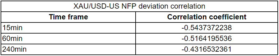 Finally, we calculated the correlation coefficient (r) to figure out at which time frame gold had the strongest correlation with an NFP surprise. When r approaches -1, it suggests there is a significant negative correlation, while a significant positive correlation is identified when r moves toward 1. Since gold is defined as XAU/USD, an upbeat NFP reading should cause it to edge lower and point to a negative correlation.