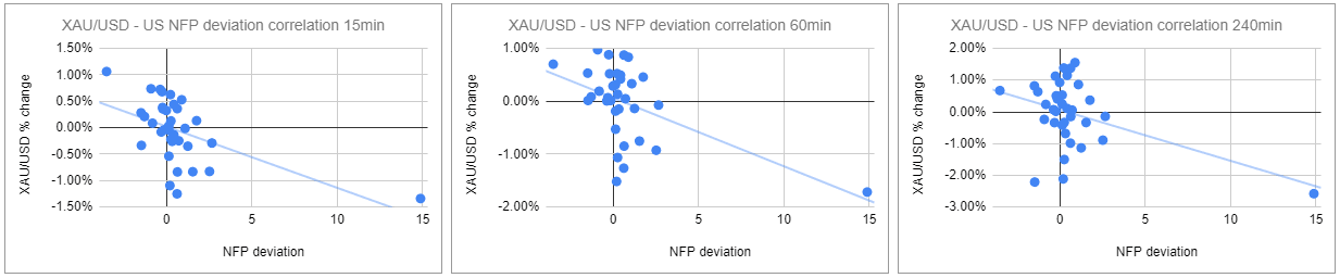 We plotted gold price’s reaction to the NFP print at 15 minutes, one hour and four hours intervals after the release. Then, we compared the gold price reaction to the deviation between the actual NFP release result and the expected result.