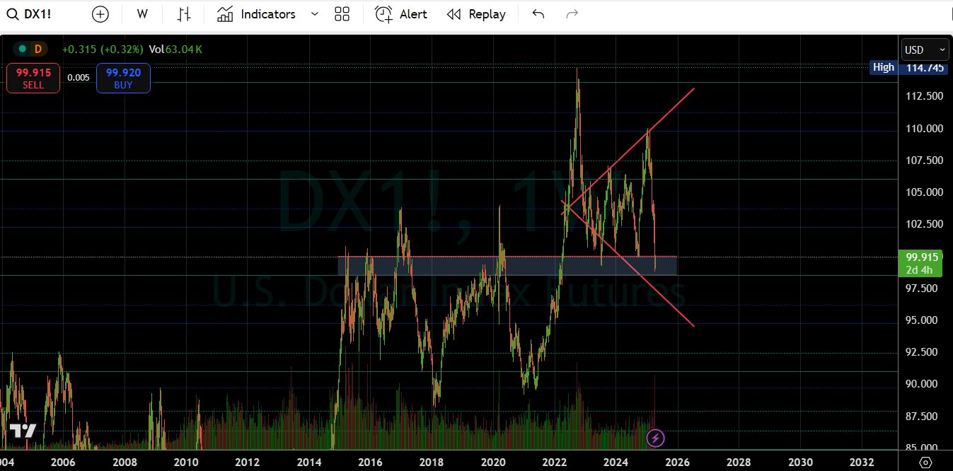 The US Dollar Index (DXY) currently sits precariously within a critical 10-year support and resistance zone between 100 and 98. Historically, this key price area has repeatedly served as a midpoint equilibrium, dictating significant directional shifts. A decisive breach below this support could unleash substantial downward momentum, targeting deeper psychological and technical levels at 95 or potentially 92.