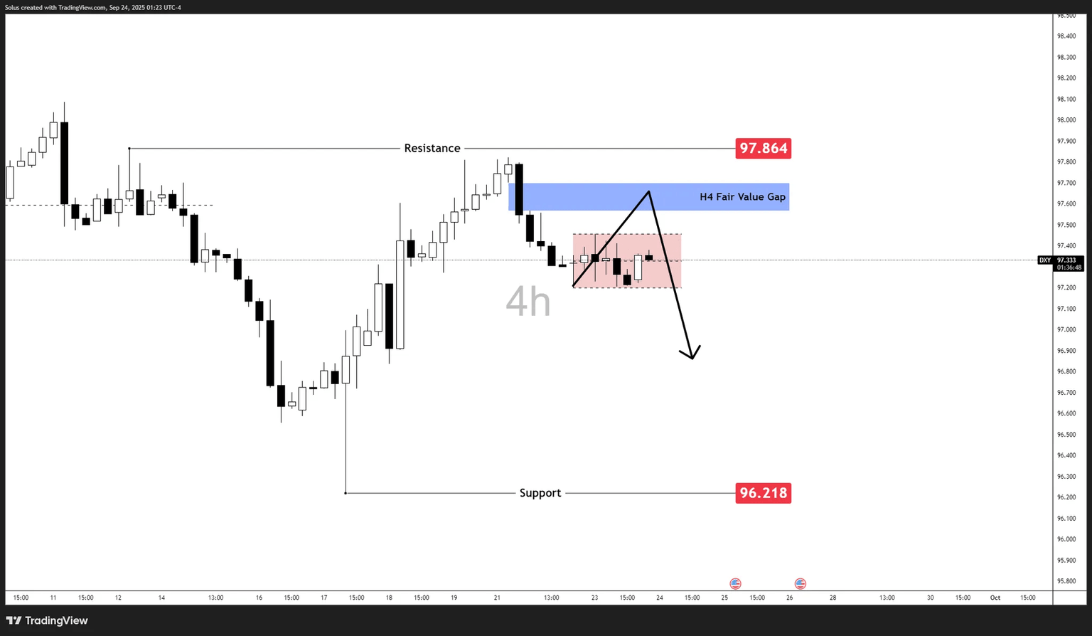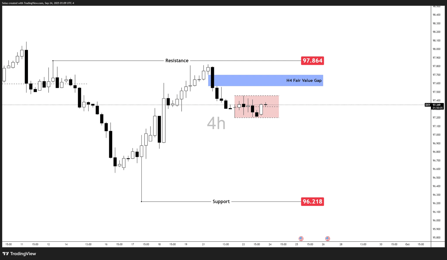 The U.S. Dollar Index (DXY) remains in consolidation, trading between 97.456 and 97.199 after rejecting the H4 Fair Value Gap (97.701–97.568). Resistance stands at 97.864, with broader support anchored at 96.218.