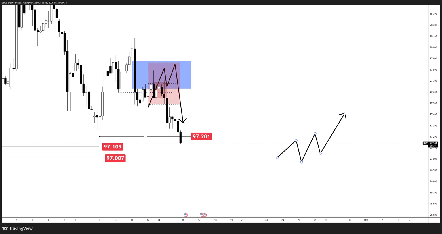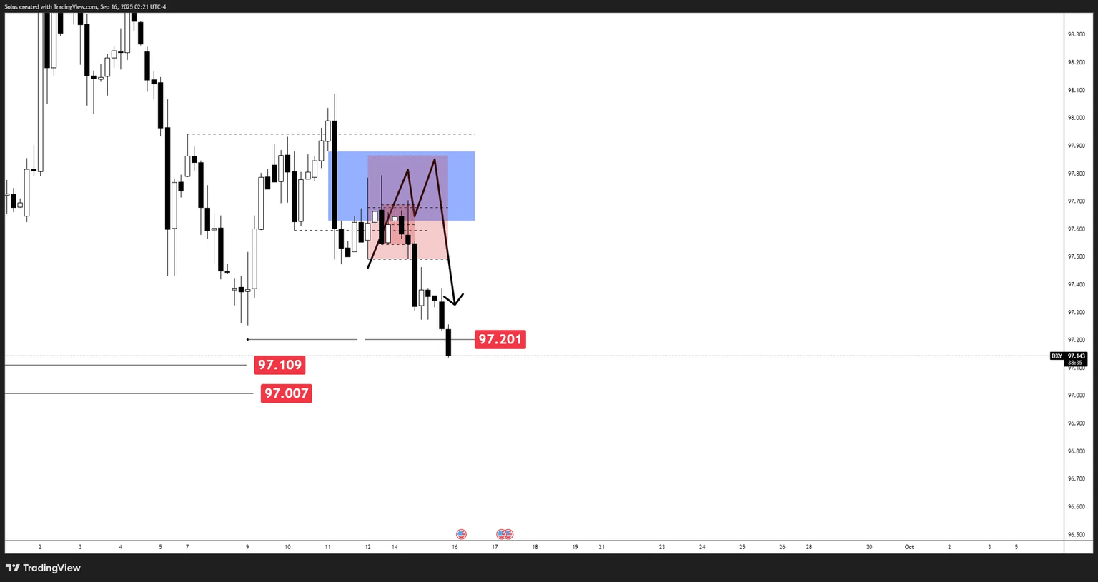 The Dollar Index (DXY) has respected the broader bearish structure, sliding from the blue supply/FVG zone (97.80–98.00) into the 97.20 region, confirming the earlier forecast of a rejection lower.
