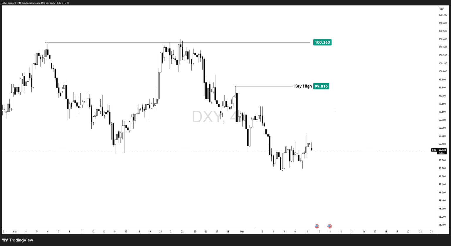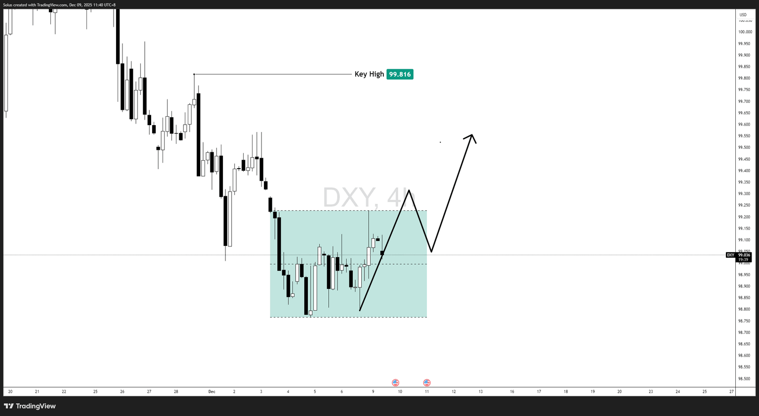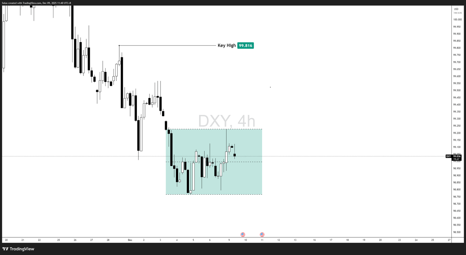 Instead, DXY is locked inside a well-defined 4H range, waiting for the next policy signal to determine its direction.