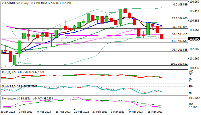 Fresh weakness broke through pivotal Fibo support at 103.28 (50% retracement of 100.70/105.85 / 55DMA) and a higher base at 103.00 zone.