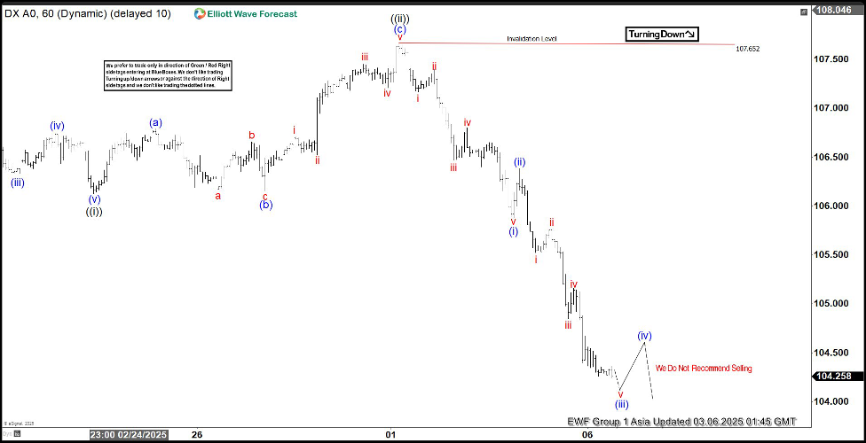 Short term Elliott Wave view in Dollar Index (DXY) suggests the decline from 1.13.2025 peak is taking the form of an impulse with extension (nesting). Down from there, wave 1 ended at 106.97 and rally in wave 2 ended at 109.88. The ETF extended lower in wave 3 which is unfolding in 5 waves in lesser degree. Down from wave 2, wave ((i)) ended at 106.12 as the 1 hour chart below shows. Rally in wave ((ii)) unfolded as a zigzag Elliott Wave structure. Up from wave ((i)), wave (a) ended at 106.79 and pullback in wave (b) ended at 106.16. Rally in wave (c) ended at 107.65 which completed wave ((ii)) in higher degree.