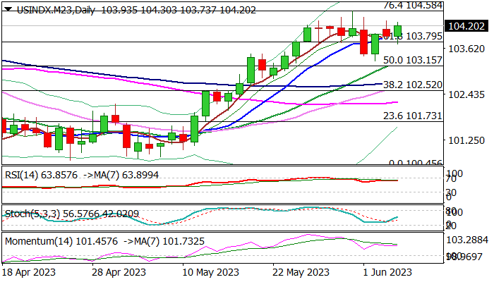 The dollar index regained traction and returned back above 104 mark on Tuesday, on track to fully retrace recent 104.58/103.30 pullback.