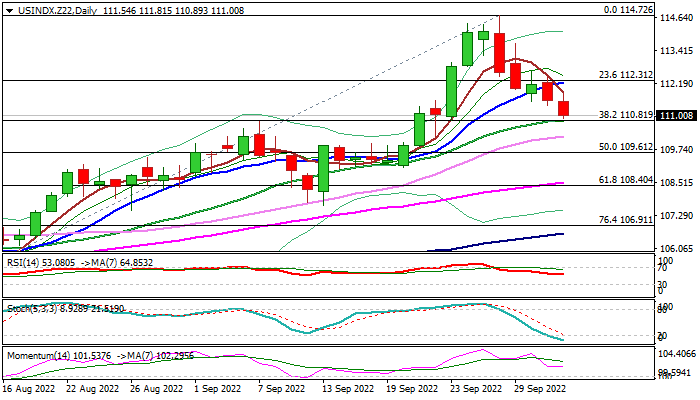 The pullback cracked 38.2% retracement of 104.49/114.72 upleg, reinforced by 20DMA (110.84) facing headwinds there, as stochastic is deeply oversold on daily chart.