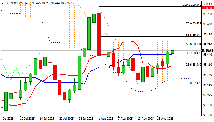 Technical picture on daily chart has improved, but bulls started to face headwinds from cracked resistance at $98.73 (50% retracement of $100.04/$97.42 bear-leg, reinforced by falling 100DMA) and nearby daily cloud top ($98.88).