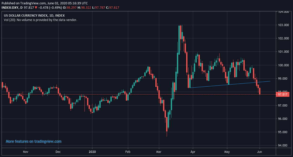 The US dollar index closed lower for a fifth consecutive day on Monday as hopes of a faster than expected global economic recovery from the COVID-19 pandemic took hold. Markets remained steady despite widespread civil unrest in the United States due to the death of George Floyd and ongoing US/China trade tensions.