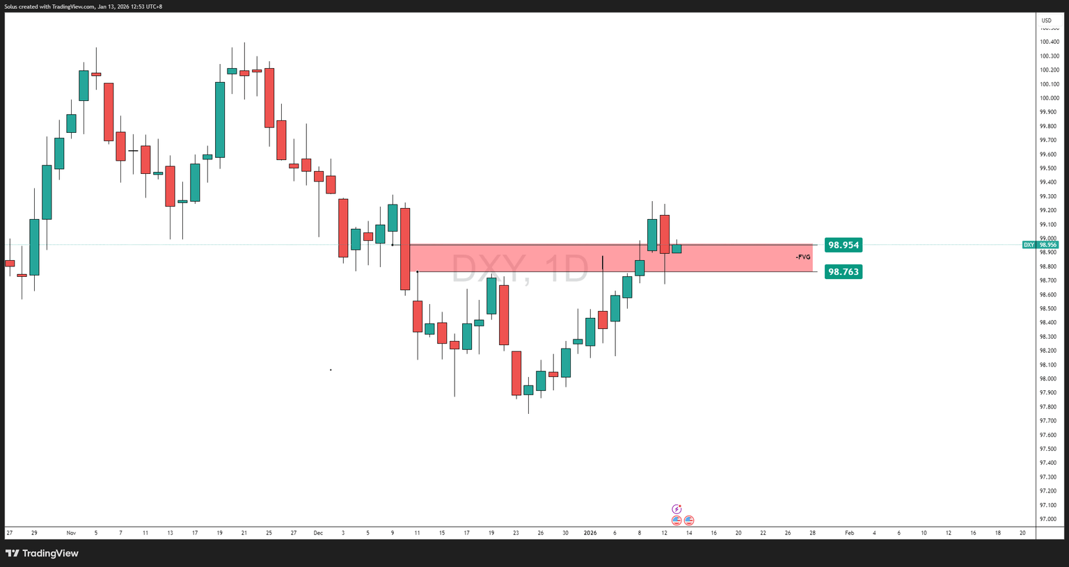 The U.S. Dollar Index (DXY) is currently trading at a technically and fundamentally sensitive zone, where price has rebounded into a daily fair value gap aligned with prior distribution. Rather than signaling immediate trend continuation, current price behavior reflects rebalancing and positioning ahead of a macro catalyst.