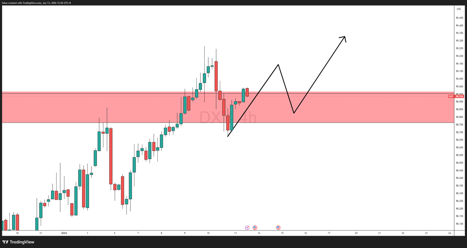 In this scenario, acceptance above current levels would signal renewed institutional confidence in USD strength, potentially pressuring gold and risk assets.