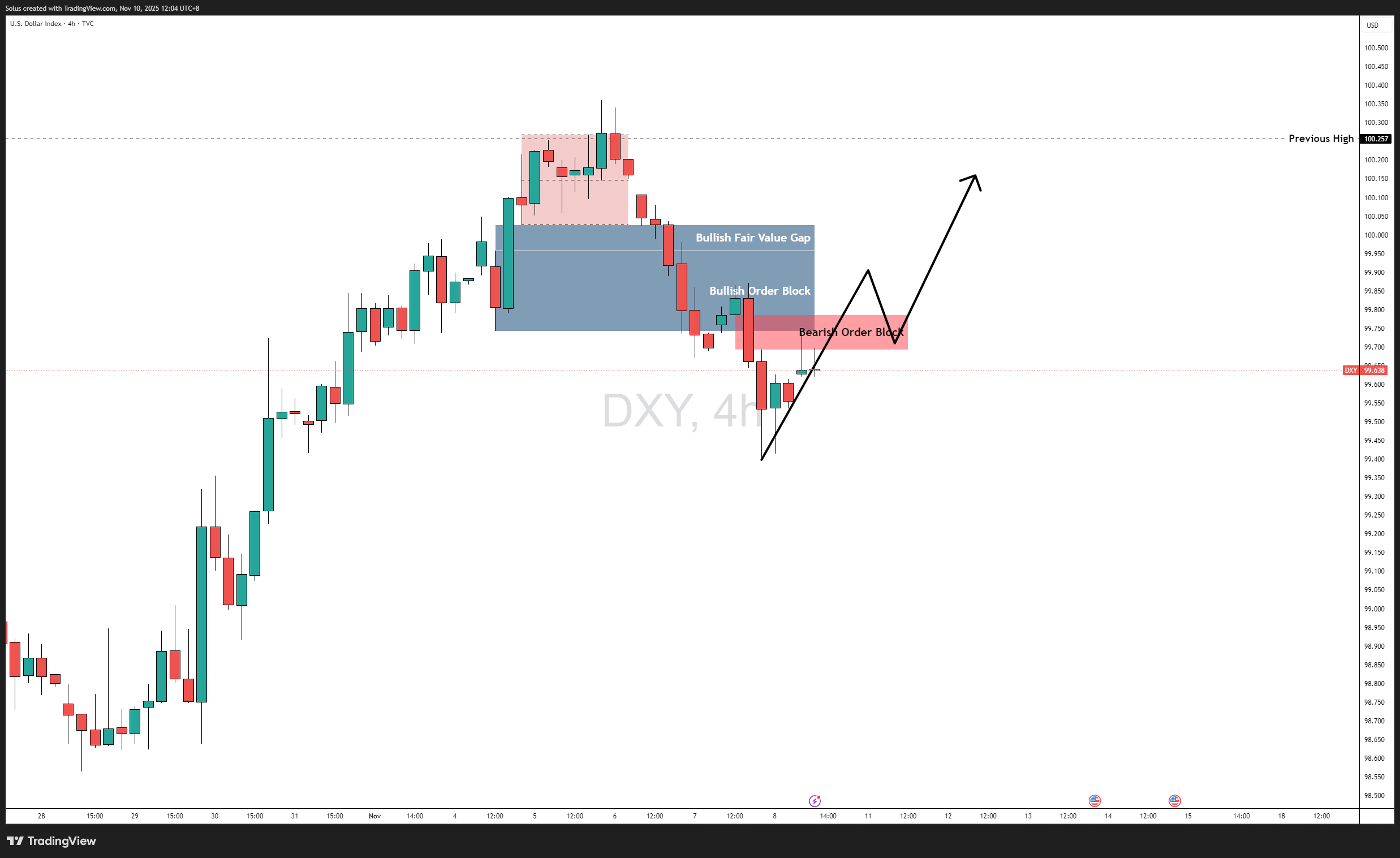 A short-term rebound remains possible if DXY can hold above 99.40 and reclaim the 99.80-99.90 zone, which now serves as the bearish order block.