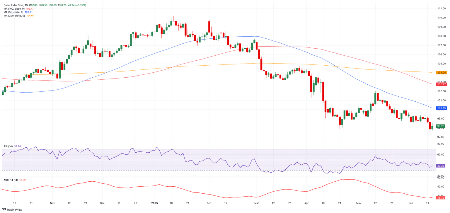 The US Dollar Index (DXY) is expected to continue its downward trend as it remains below the 200-day and 200-week Simple Moving Averages (SMAs), currently at 103.97 and 102.92, respectively.