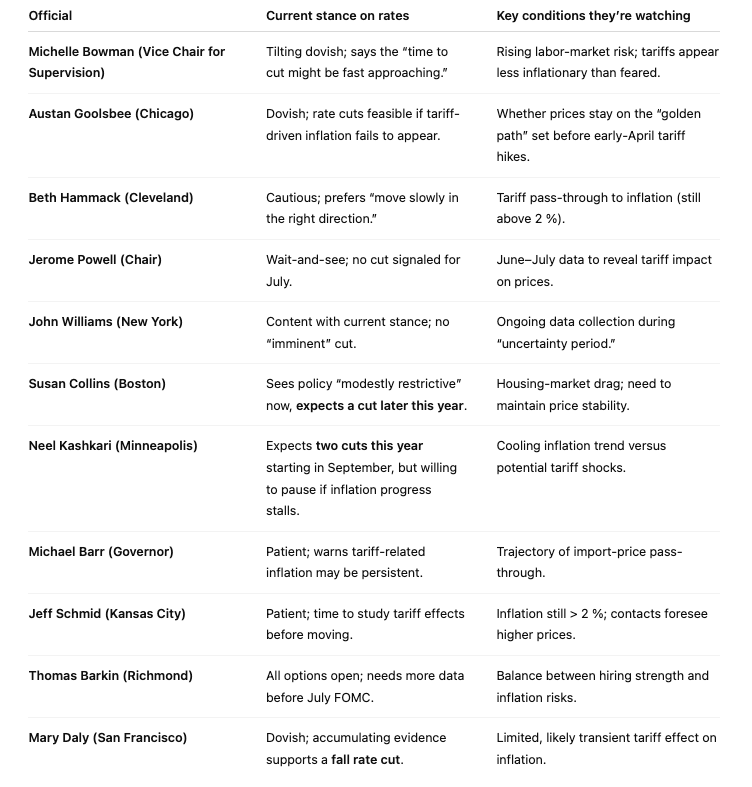 - Dovish bloc (Bowman, Goolsbee, Collins, Kashkari, Daly) sees cooling inflation and limited tariff pass-through as grounds for rate cuts starting in the fall, some advocating as many as two moves.