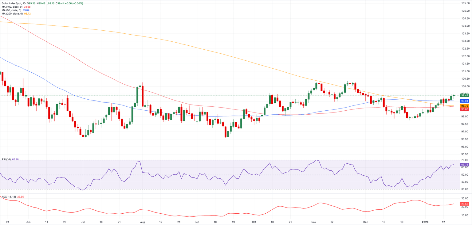 After bottoming out around 97.70 on December 24, the US Dollar Index (DXY) has staged a solid rebound. The recovery has seen the DXY not only regain the 99.00 handle, but also push decisively back above its key 200-day Simple Moving Average (SMA) near 98.70.
