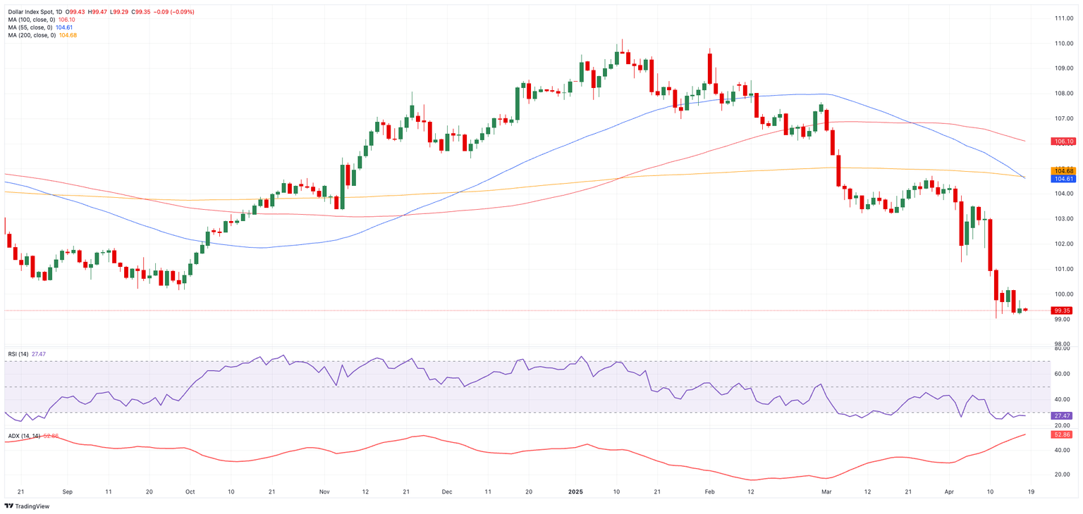Key support lies at 99.01 (2025 floor set on April 11) and 97.68 (March 30, 2022). A bounce could retest 104.68 (March 26), with resistance levels at the 55-day SMA (104.60), 100-day SMA (106.05), and 107.66 (February 28 high).