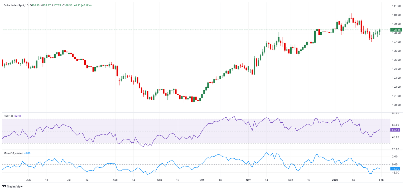 The US Dollar Index (DXY) could extend its upward momentum, potentially retesting its recent cycle high of 110.17 from January 13. A break above this level would set the stage for a challenge of the 2022 peak at 114.77, marked on September 28.