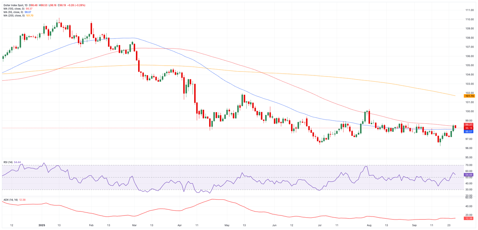 On the other hand, the August high, at 100.26 (August 1), is the first big hurdle. Clearing it would put the May weekly peak at 100.54 (May 29) and the May ceiling at 101.97 (May 12) back on the radar. For now, the index remains capped below both the 200-day SMA (101.73) and the 200-week SMA (103.22), keeping the broader bias tilted lower.