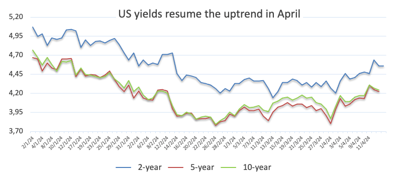 The Dollar's positive performance this week coincided with the climb to multi-month peaks in US yields across different maturity periods, always against the renewed macro environment that points to just one or two rate cuts for the remainder of the year.