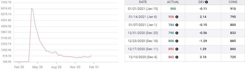 Claims have continued at a much higher pace in January averaging 870,000 for the three weeks through January 15 and are projected to be 878,000 on January 22 due on Thursday.