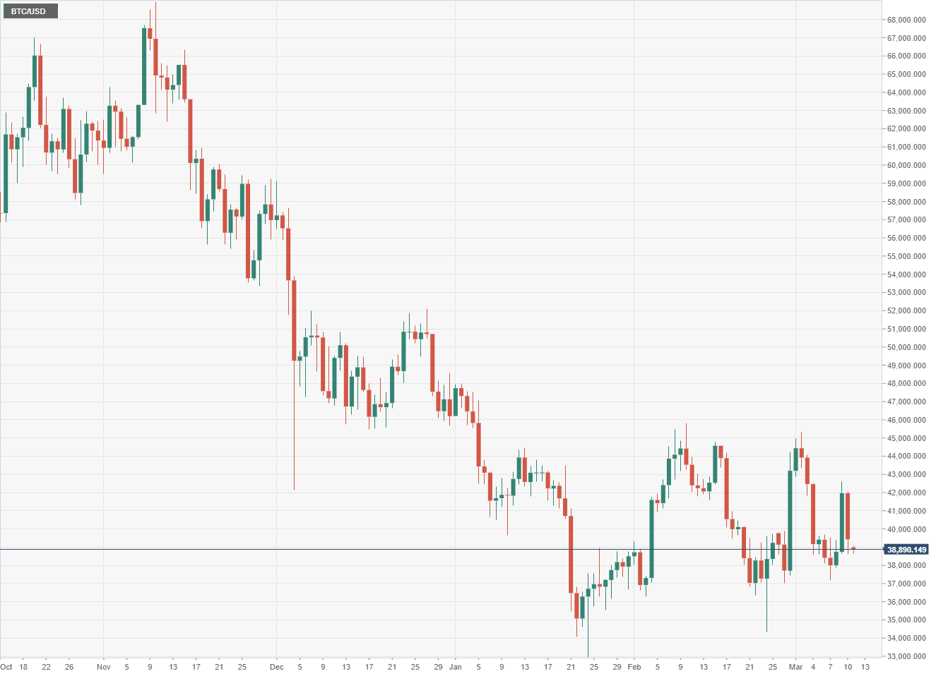 Bitcoin reversed Wednesday's gain, falling from 41,964 to 38,430.