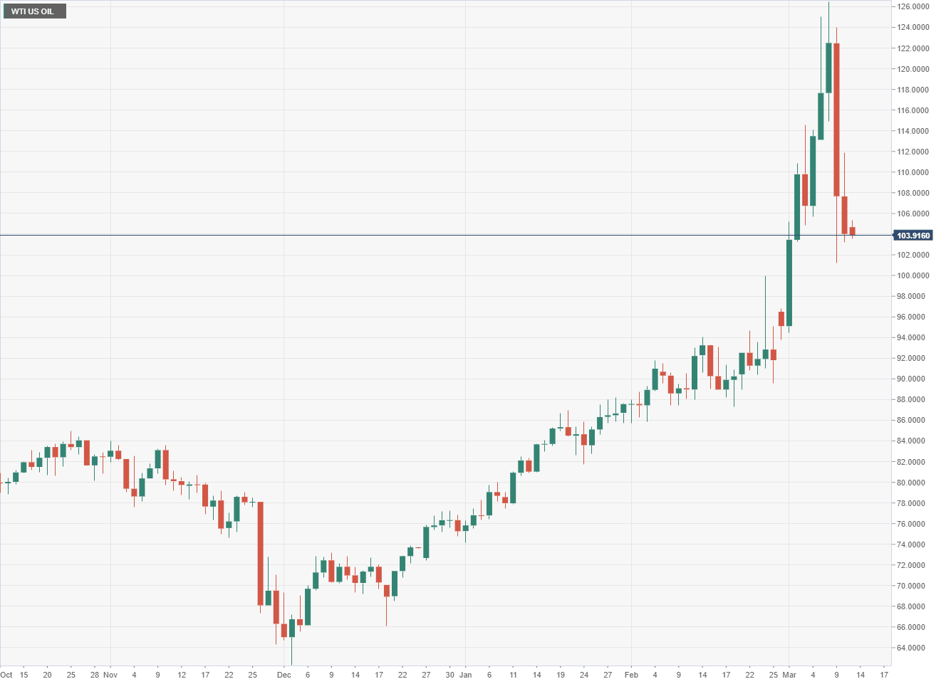 On Wednesday, March 8 Brent had closed at $127.30, a 30.2% increase and WTI finished at $122.50, up 28.8%.