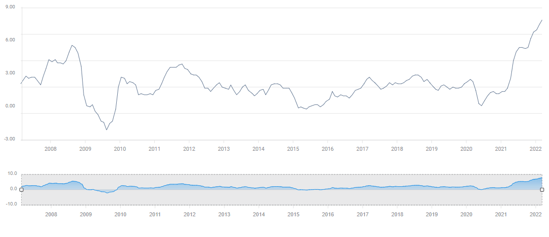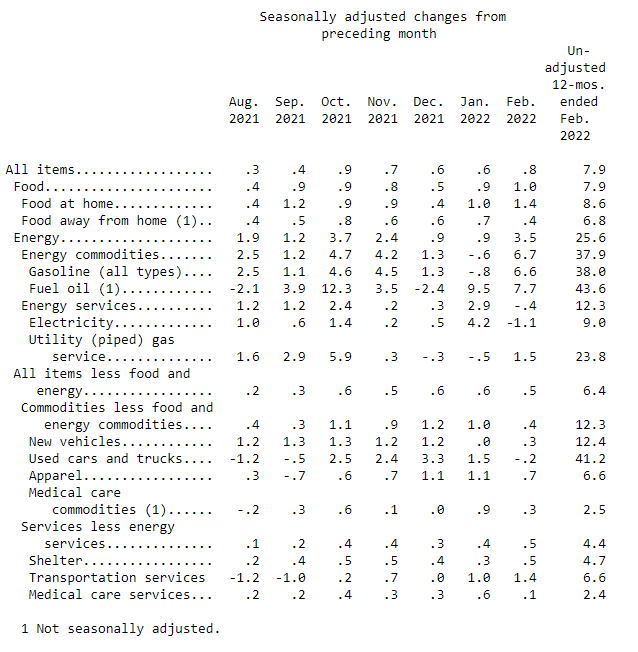 The February Consumer Price Index (CPI) increased 7.9% in a year, the seventh month in a row that the index has set a new 40-year record, and the fastest increase since January 1982, reported the Bureau of Labor Statistics on Thursday. For the month prices jumped 0.8%.