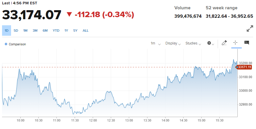 The Dow lost 112.18 points, 0.34% to 33,174.07, though it was considerably lower and slightly higher through the course of the day. The S&P 500 shed 0.43%, 18.36 points to 4,259.52 and the Nasdaq dropped 125.58 points, 0.95% to 13,129.96.