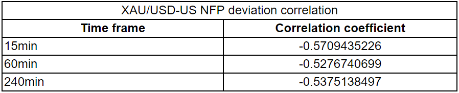 Finally, we calculated the correlation coefficient (r) to figure out at which time frame gold had the strongest correlation with an NFP surprise. When r approaches -1, it suggests there is a significant negative correlation, while a significant positive correlation is identified when r moves toward 1. Since gold is defined as XAU/USD, an upbeat NFP reading should cause it to edge lower and point to a negative correlation.