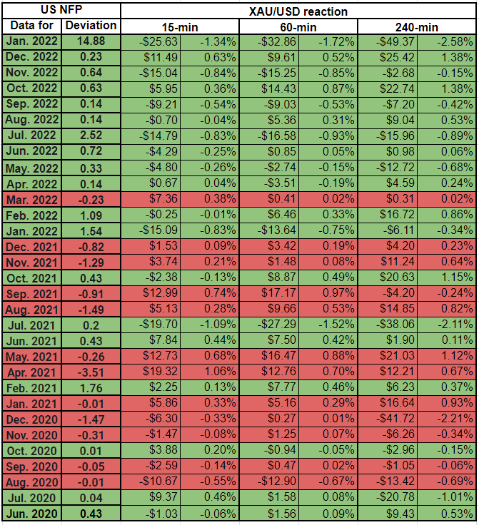 Historically, how impactful has the US jobs report been on gold’s valuation? In this article, we present results from a study in which we analyzed the XAUUSD pair's reaction to the previous 31 NFP prints*.