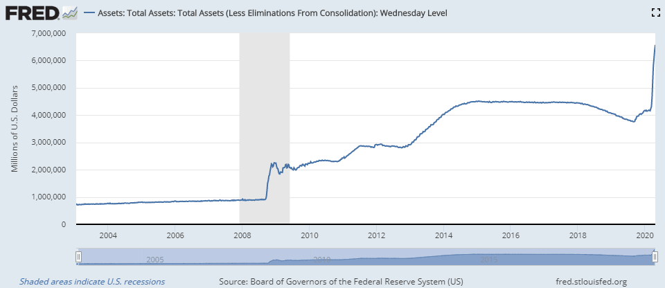 In doing all this the Fed's balance sheet has risen to an all-time high of $6.6 trillion, surpassing the $4.5 total during the financial crisis. In two months (February 26 to April 22) the central bank has added $2.4 trillion in assets, meaning it has purchased that amount of financial instruments from the market. In six years of financial crisis purchases (September 2008 to January 2014) the bank added $3.6 trillion in assets.