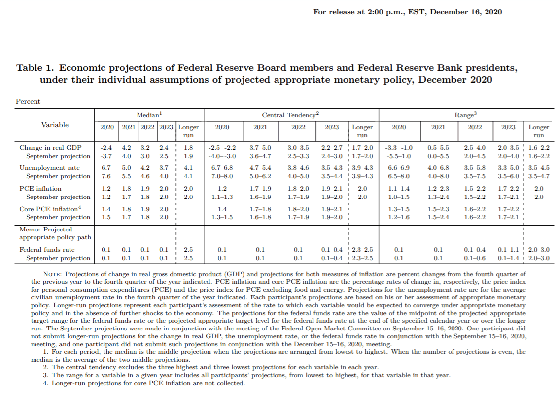The final set of estimates in December had 2020 GDP at -2.4%, 2021 at 4.2%, unemployment at 6.7%, 5% in 2021, and Core PCE at 1.4% followed by 1.8% in 2021.