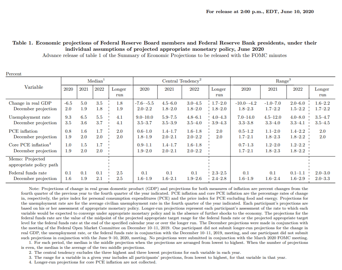 The June estimate saw the US GDP contracting 6.5% in 2020 and expanding 5.0% in 2021. Unemployment was expected to be 9.3% at the end of 2020 and 6.5% by December 2021. Core PCE at 1% last year and 1.5% this December.